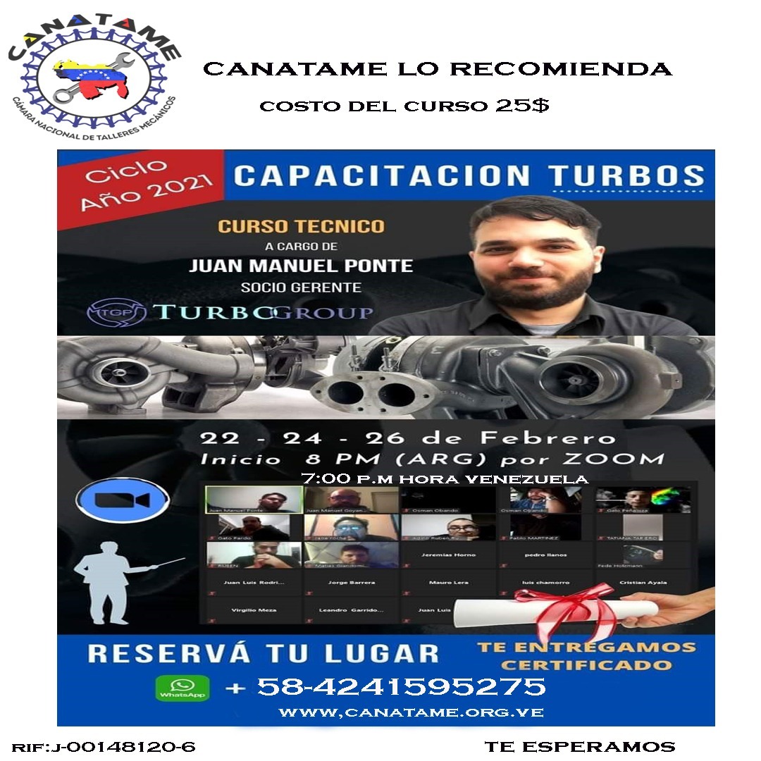 22 febrero, 2021/8:00 pm CAPACITACIÓN TURBOS Curso Avalado por CANATAME COSTO: 25 $ al cambio del BCV.