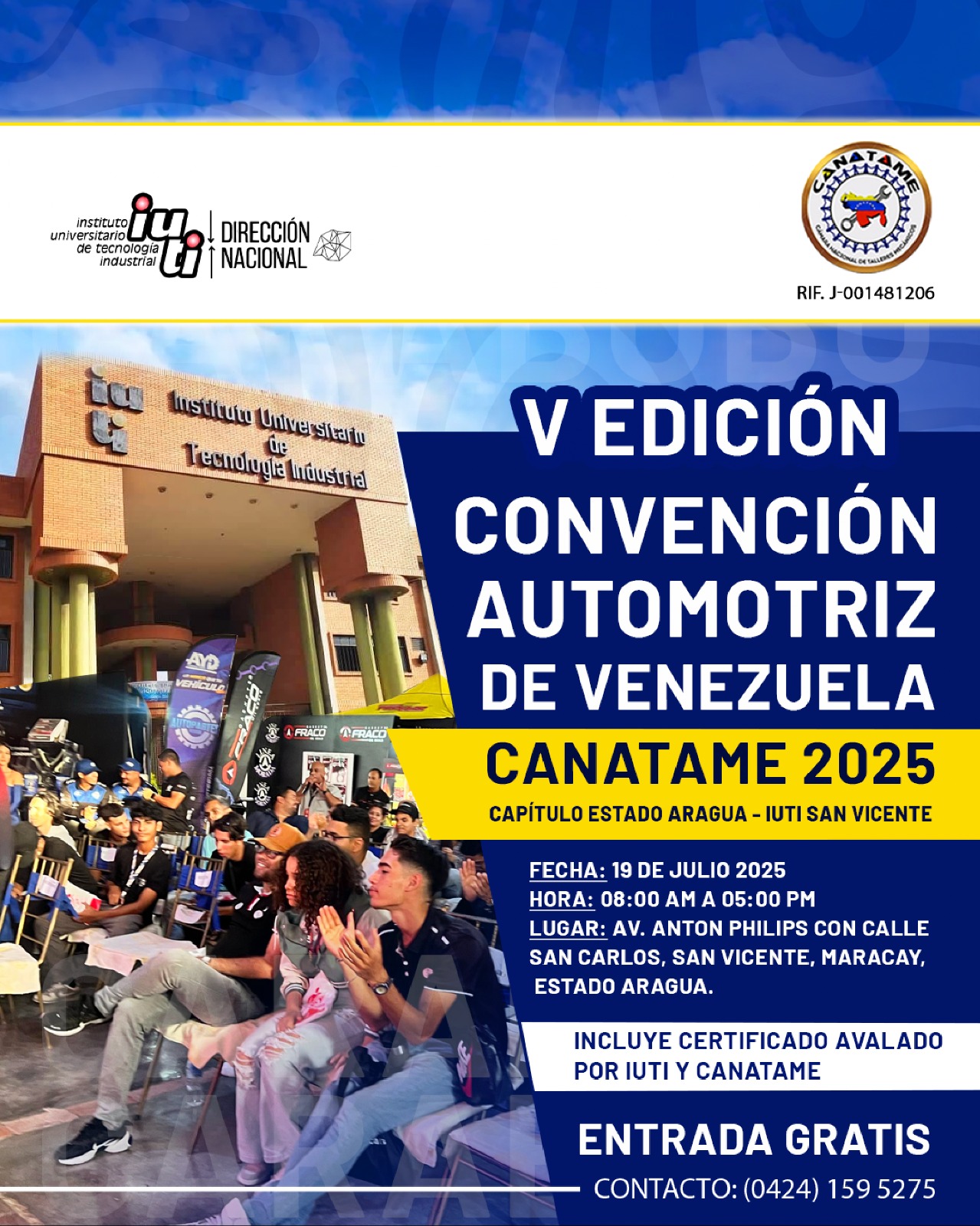 IUTI SAN VICENTE, ESTADO ARAGUA Av. Anton Philips con, Calle San Carlos, Maracay 2101, Aragua, Maracay, Aragua, VenezuelaY la Cámara Nacional de Talleres Mecánicos (CANATAME) vuelve con su emblemático evento, Convención Automotriz de Venezuela Canatame 2025, capítulo estado Aragua. Fecha: 19 de julio de 2025. Hora: 8am a 5:00 pm Lugar: Sede del IUTI, San Vicente, Maracay, estado Aragua. Entrada gratis Los propósitos de estas actividades son, aprender de expertos líderes en […]