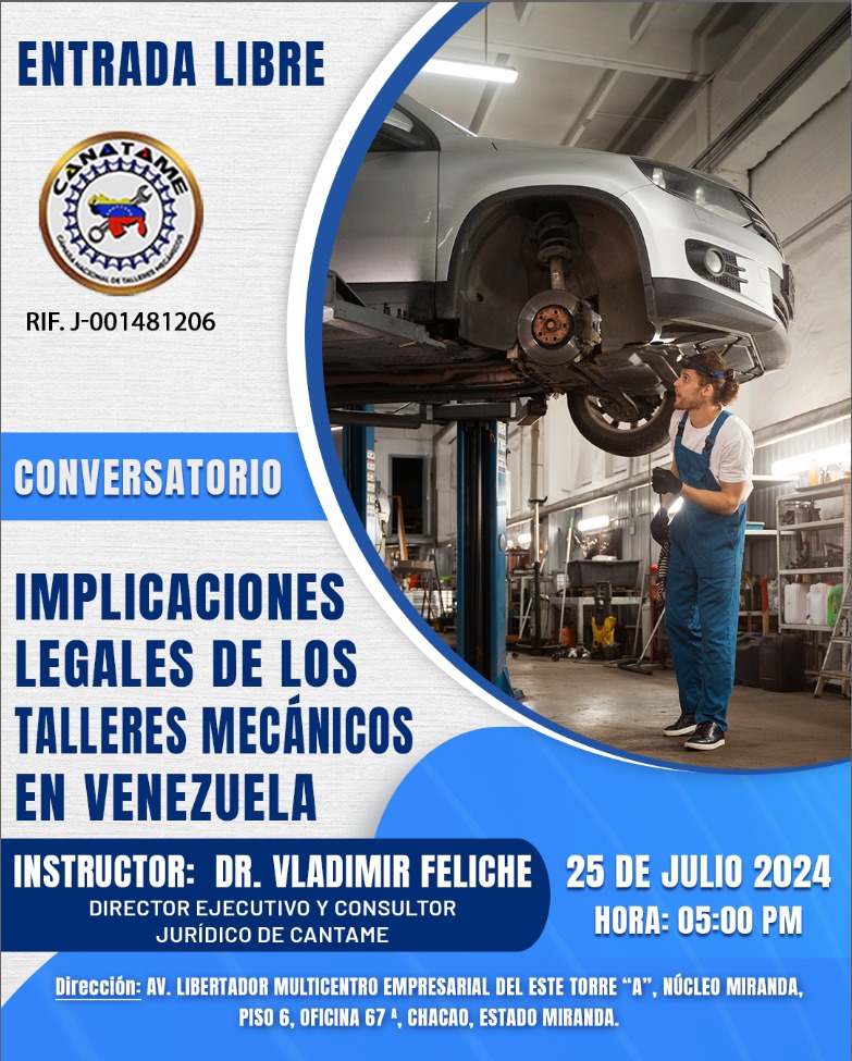 CANATAME Av. Libertador, Multicentro Empresarial del Este, Edif. Miranda, Piso 6, Ofic. 67-A, Chacao, Caracas, CaracasCANATAME tiene el placer de invitar a los agremiados y público en general al Conversatorio “IMPLICACIONES LEGALES DE LOS TALLERES MECÁNICOS EN VENEZUELA”, el día 25 de julio de 2024, a las 5:00 pm., con el director ejecutivo y consultor jurídico Dr Vladimir Feliche. Tendrás la oportunidad de conocer más acerca del funcionamiento legal de […]